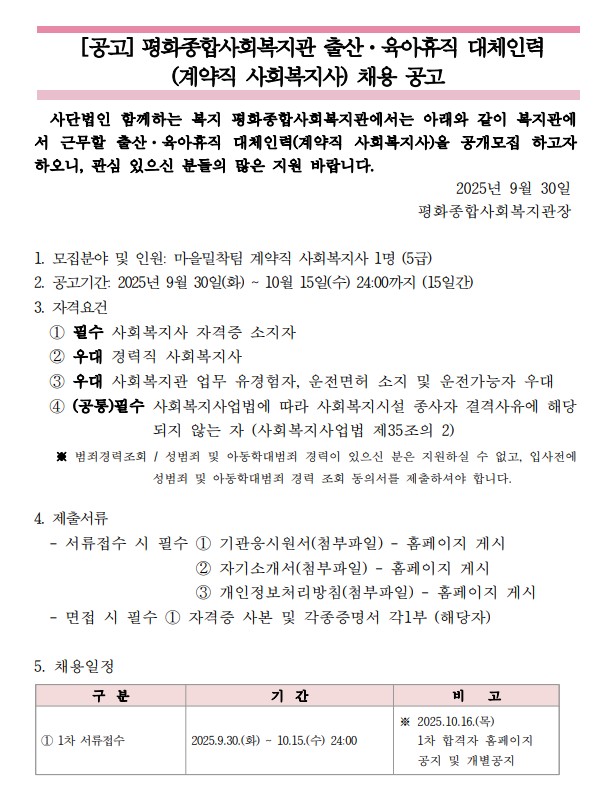 ÆòÈÁ¾ÇÕ»çȸº¹Áö°ü Ãâ»ê¡¤À°¾ÆÈÞÁ÷ ´ëüÀη °è¾àÁ÷ ä¿ë °ø°í