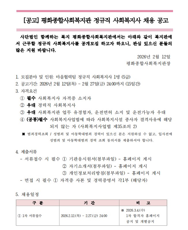 ºÙÀÓ1. ±â°üä¿ë¼·ù - ÆòÈÁ¾ÇÕ»çȸº¹Áö°ü(Á¤±ÔÁ÷ »çȸº¹Áö»ç) 2026.2.12..hwp