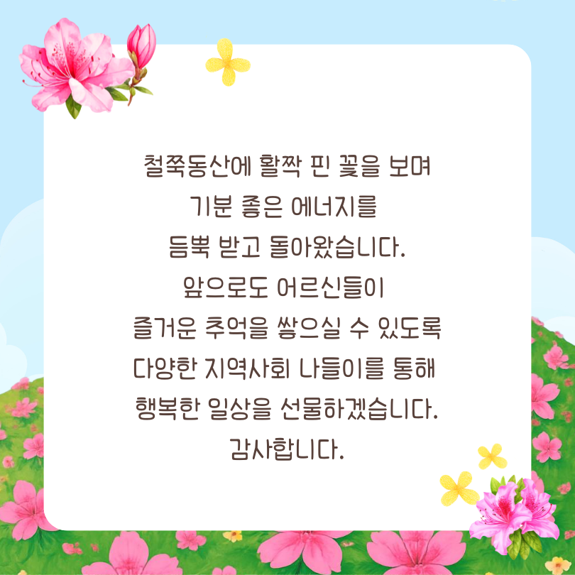 ¾ÕÀ¸·Îµµ ¾î¸£½ÅµéÀÌ Áñ°Å¿î Ãß¾ïÀ» ½×À¸½Ç ¼ö ÀÖµµ·Ï ´Ù¾çÇÑ Áö¿ª»çȸ ³ªµéÀ̸¦ ÅëÇØ ÇູÇÑ ÀÏ»óÀ» ¼±¹°ÇϰڽÀ´Ï´Ù.