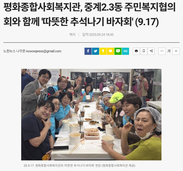 ÆòÈÁ¾ÇÕ»çȸº¹Áö°üÀº 9¿ù 17ÀÏ, º¹Áö°ü 2Ãþ ÇÁ·Î±×·¥½Ç°ú 1Ãþ ½Ä´ç¿¡¼ Áö¿ªÁÖ¹ÎÀ» ´ë»óÀ¸·Î 2025³â Áß°è2¡¤3µ¿ Áֹκ¹ÁöÇùÀÇȸ¿Í ÇÔ²²ÇÏ´Â ¡¯µû¶æÇÑ Ãß¼®³ª±â ¹ÙÀÚȸ¡¯¸¦ ¿î¿µÇß´Ù. À̹ø Çà»ç´Â Áö¿¬ÁÖ¹ÎÀÇ Âü¿©¿Í ³ª´® ¹®È¸¦ È®»êÇϰí, Çà»ç ¼öÀͱÝÀ» ÅëÇØ ¸íÀý ŰƮ¸¦ ¸¶·ÃÇÏ¿© Áö¿ª ³» Ãë¾à°èÃþ °¡±¸¿¡ Àü´ÞÇϱâ À§ÇØ ¸¶·ÃµÇ¾ú´Ù.