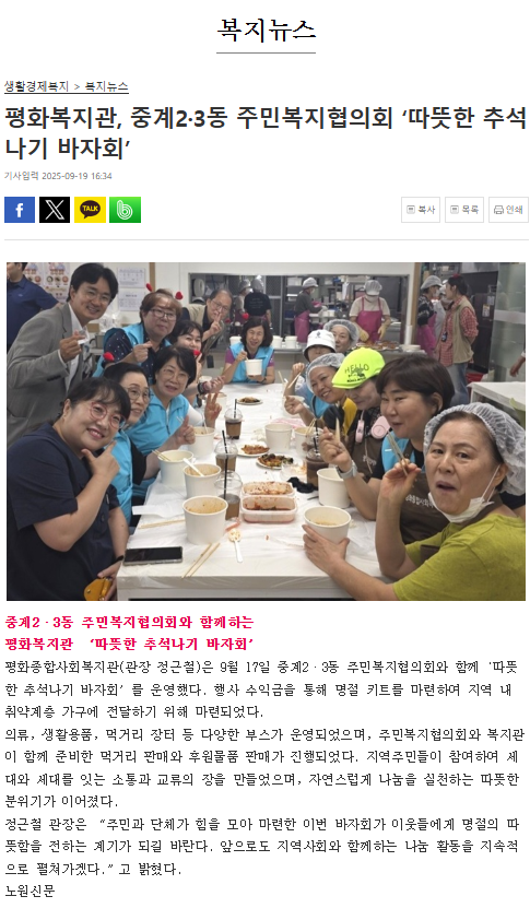 ÆòÈÁ¾ÇÕ»çȸº¹Áö°ü(°üÀå Á¤±Ùö)Àº 9¿ù 17ÀÏ Áß°è2¡¤3µ¿ Áֹκ¹ÁöÇùÀÇȸ¿Í ÇÔ²² 'µû¶æÇÑ Ãß¼®³ª±â ¹ÙÀÚȸ¡¯¸¦ ¿î¿µÇß´Ù. Çà»ç ¼öÀͱÝÀ» ÅëÇØ ¸íÀý ŰƮ¸¦ ¸¶·ÃÇÏ¿© Áö¿ª ³» Ãë¾à°èÃþ °¡±¸¿¡ Àü´ÞÇϱâ À§ÇØ ¸¶·ÃµÇ¾ú´Ù.