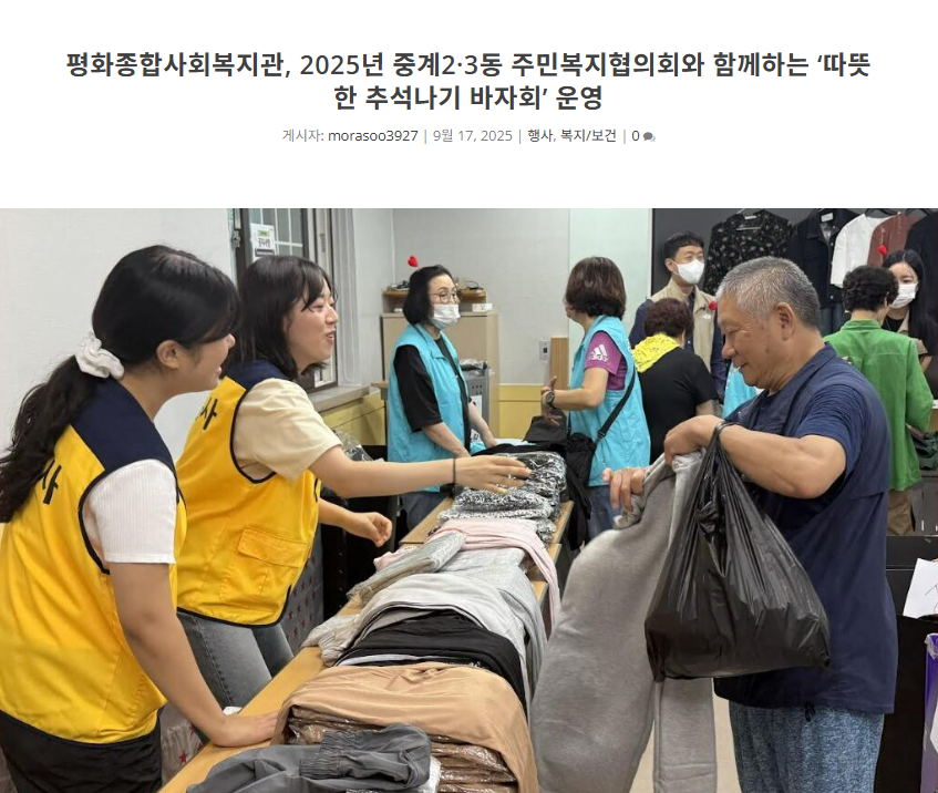 ÆòÈÁ¾ÇÕ»çȸº¹Áö°ü(°üÀå Á¤±Ùö)Àº 9¿ù 17ÀÏ Áß°è2¡¤3µ¿ Áֹκ¹ÁöÇùÀÇȸ¿Í ÇÔ²² 'µû¶æÇÑ Ãß¼®³ª±â ¹ÙÀÚȸ¡¯¸¦ ¿î¿µÇß´Ù. Çà»ç ¼öÀͱÝÀ» ÅëÇØ ¸íÀý ŰƮ¸¦ ¸¶·ÃÇÏ¿© Áö¿ª ³» Ãë¾à°èÃþ °¡±¸¿¡ Àü´ÞÇϱâ À§ÇØ ¸¶·ÃµÇ¾ú´Ù.