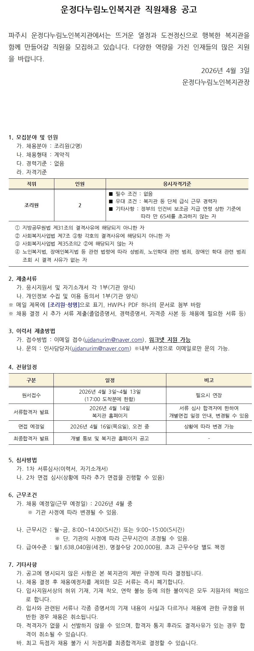 [¿îÁ¤´Ù´©¸²³ëÀκ¹Áö°ü] °è¾àÁ÷ Á¶¸®¿ø ä¿ë °ø°í(±ä±Þ)